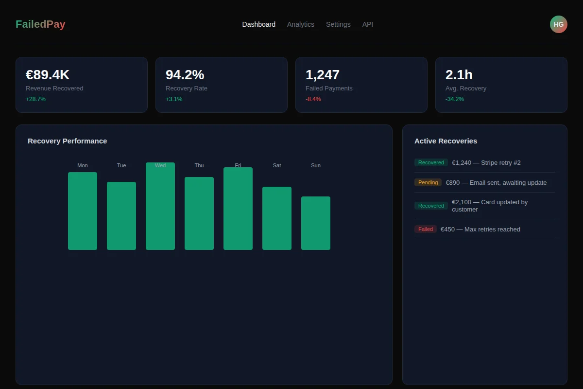 Monitor failed payments, recovery attempts, and success rates in real-time with our intuitive dashboard.